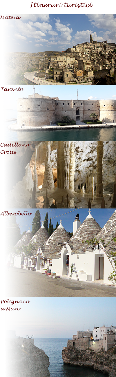 Matera, Taranto, Alberobello, Castellana grotte, Polignano a Mare, Martina Franca e la Valle d'Itria, sono tutte bellezze imperdibili e poste entro un raggio di 35 km da Castellaneta.